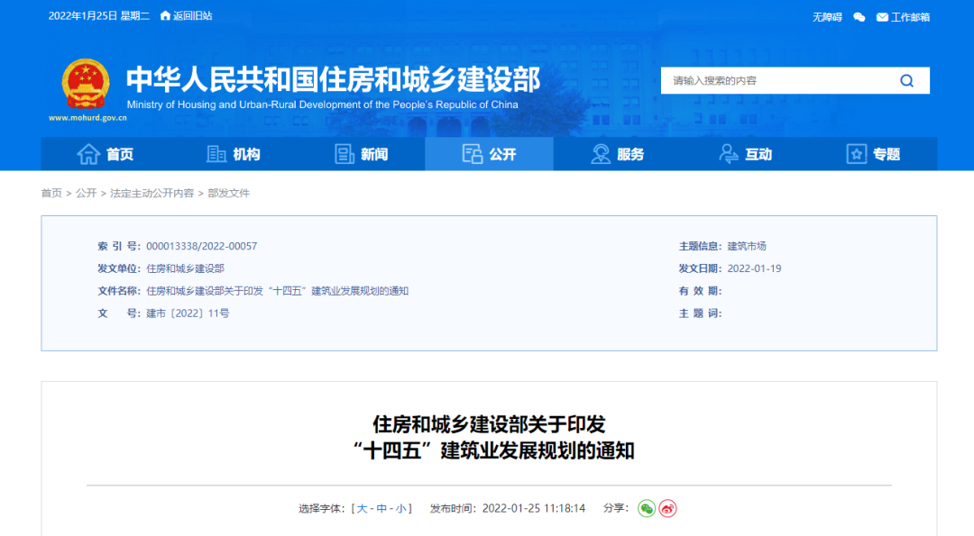 今日,住建部發(fā)布《關于印發(fā)“十四五”建筑業(yè)發(fā)展規(guī)劃的通知》,提出發(fā)展目標及主要任務等。