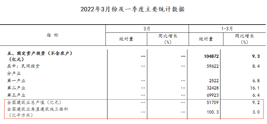 據(jù)統(tǒng)計,1-3月,全國建筑業(yè)總產(chǎn)值51709億元,同比增長9.2%;全國建筑業(yè)房屋建筑施工面積100.3億平方米,同比增長3.0%。