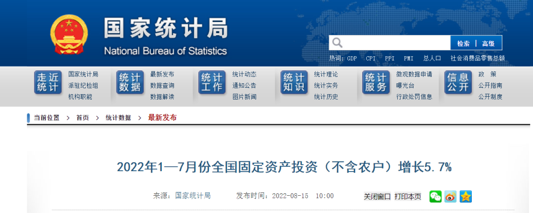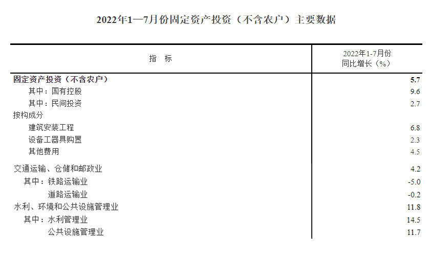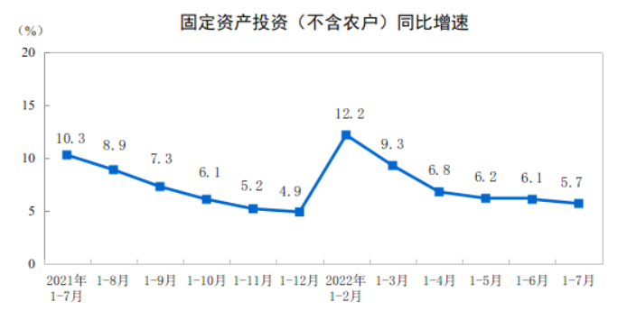據(jù)國家統(tǒng)計(jì)局消息,1—7月份,各地區(qū)各部門高效統(tǒng)籌疫情防控和經(jīng)濟(jì)社會(huì)發(fā)展,扎實(shí)推進(jìn)穩(wěn)投資系列舉措,加快發(fā)行使用地方政府專項(xiàng)債券,適度超前開展基礎(chǔ)設(shè)施投資,著力推進(jìn)重大項(xiàng)目建設(shè),盤活存量資產(chǎn)擴(kuò)大有效投資,全國固定資產(chǎn)投資(不含農(nóng)戶)同比增長5.7%。從環(huán)比看,7月份全國固定資產(chǎn)投資(不含農(nóng)戶)增長0.16%。