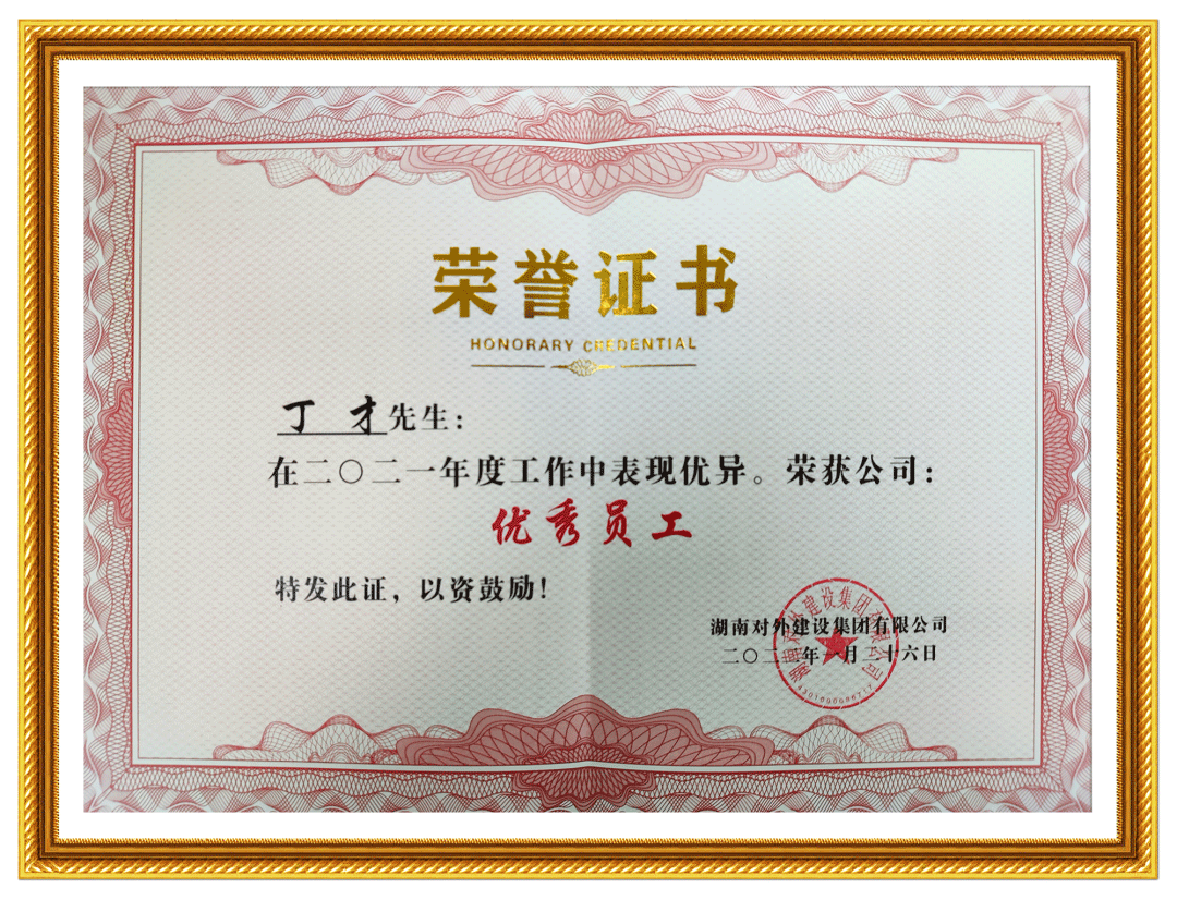 丁才于2020年10月加入外建公司。他為人正直,工作認真積極,與同事相處融洽。先后擔任杭紹臺高速鏡湖互通連接線工程項目任項目副總工及工程管理部技術主管。