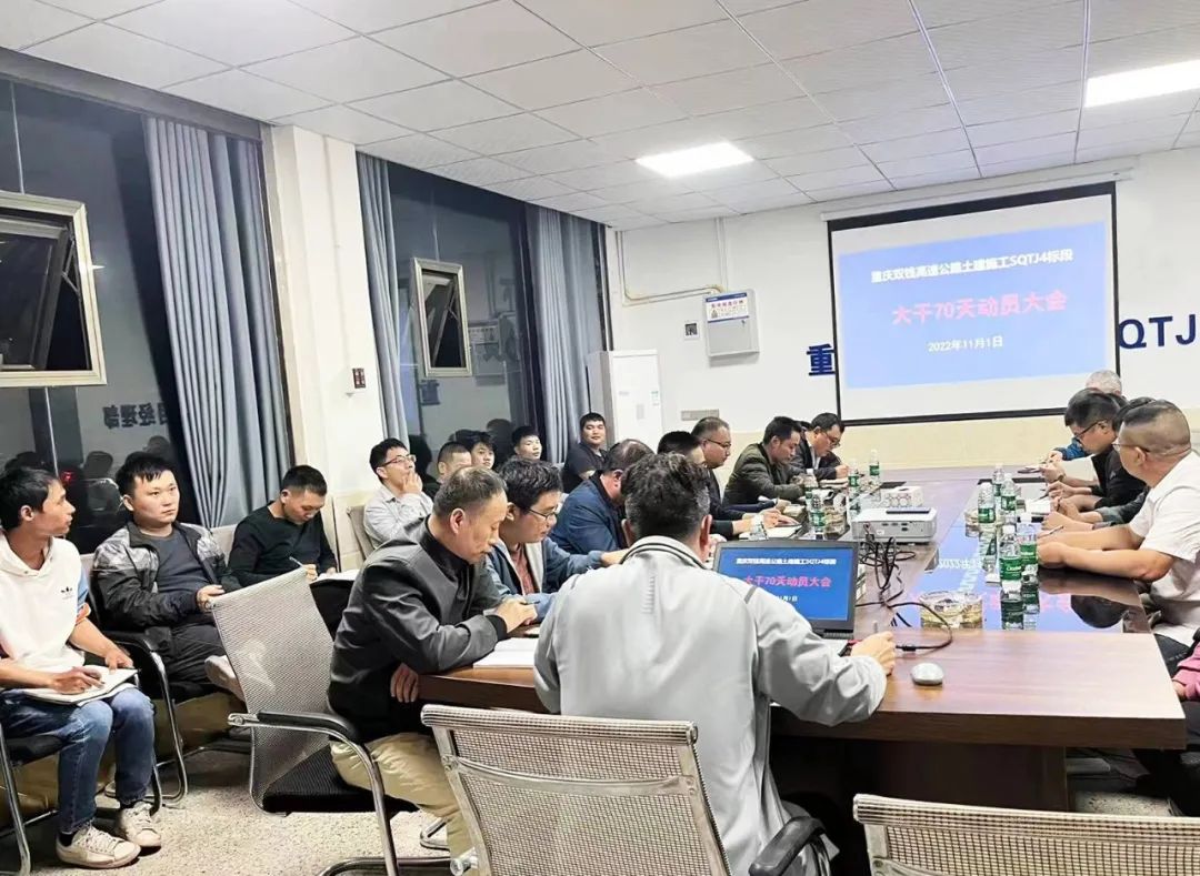 2022 年是重慶雙錢高速公路建設(shè)的關(guān)鍵一年,第四季度也是完成全年計(jì)劃任務(wù)的關(guān)鍵階段。為積極響應(yīng)“大干 70 天”勞動(dòng)競(jìng)賽活動(dòng)的號(hào)召,重慶雙錢高速公路SQTJ4標(biāo)段項(xiàng)目于2022年11月1日組織召開了全體人員會(huì)議,項(xiàng)目部總工陳儒睿在“大干 70 天”的生產(chǎn)動(dòng)員大會(huì)上做了充分的動(dòng)員,并宣導(dǎo)了2022 年“大干 70 天”施工進(jìn)度計(jì)劃,介紹項(xiàng)目工程概況和目前完成實(shí)體工程的情況,同時(shí)制定了“大干 70 天”生產(chǎn)產(chǎn)值計(jì)劃任務(wù),并布置和分解了10周生產(chǎn)施工任務(wù),分配到每個(gè)人、每個(gè)部門及各施工隊(duì)伍,要求組織到位、落實(shí)到位、宣傳到位、完成到位。每周必須按照施工計(jì)劃和施工任務(wù)循序漸進(jìn),確保任務(wù)的完成,要打一個(gè)勝利仗,更要打一個(gè)漂亮仗。